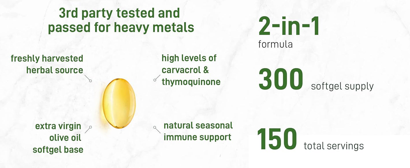 Oregano oil and black seed oil are traditionally used to support immune health, respiratory function, and overall wellness. This combination delivers powerful plant-based compounds like carvacrol and thymoquinone, which help promote antioxidant protection and daily immune balance.